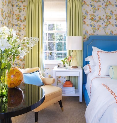 Với nhiều màu sắc tươi sáng, căn phòng ngủ dưới đây không chỉ là nơi nghỉ ngơi mà còn giống như một địa điểm tụ tập thân mật của gia đình và bạn bè. Các tông màu cam nhạt, xanh dương và xanh lá được kết hợp hài hòa đã tạo nên dáng vẻ thân thiện, chào đón bất cứ ai bước vào căn phòng. Họa tiết tường hoa nhẹ nhàng phản chiếu ánh sáng, mang đến cảm giác tươi vui đầy hứng khởi.
