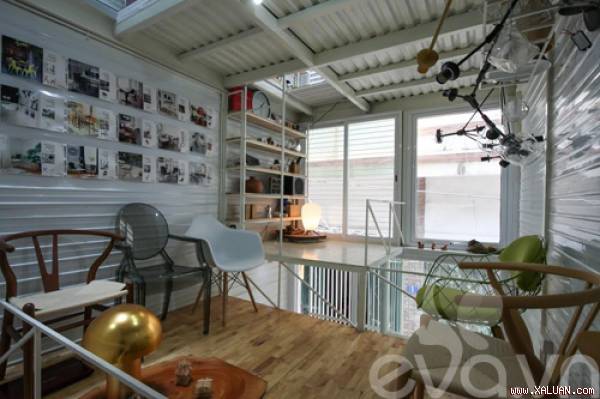 Công trình được xây dựng trên khu đất rộng 10m2, 3 mặt tiếp giáp nhà và mặt tiền ngõ hẹp hơn 1m. Mất vài tháng thi công, văn phòng đã được “lắp ráp” hoàn thiện với không gian có đủ gió và ánh sáng tự nhiên.